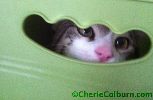 Gus, the Wonder Cat, peaking out to see if it’s time to draw a name from the box yet.